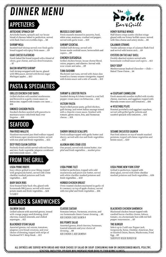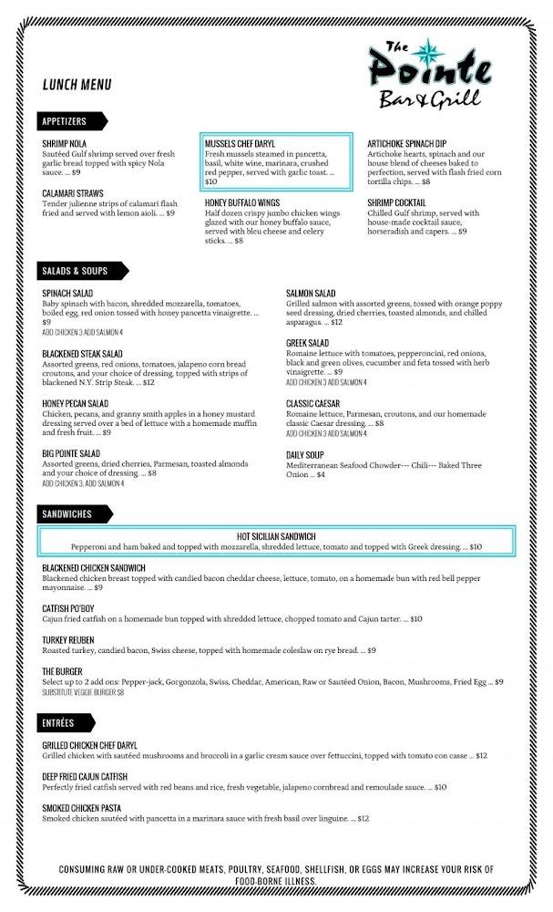 The menu at The Pointe Bar & Grill brims with variety. Hand-cut steaks, like the USDA Prime Ribeye, dominate the grill section. Seafood lovers can delight in offerings like deep-fried Cajun catfish and sesame-encrusted salmon.